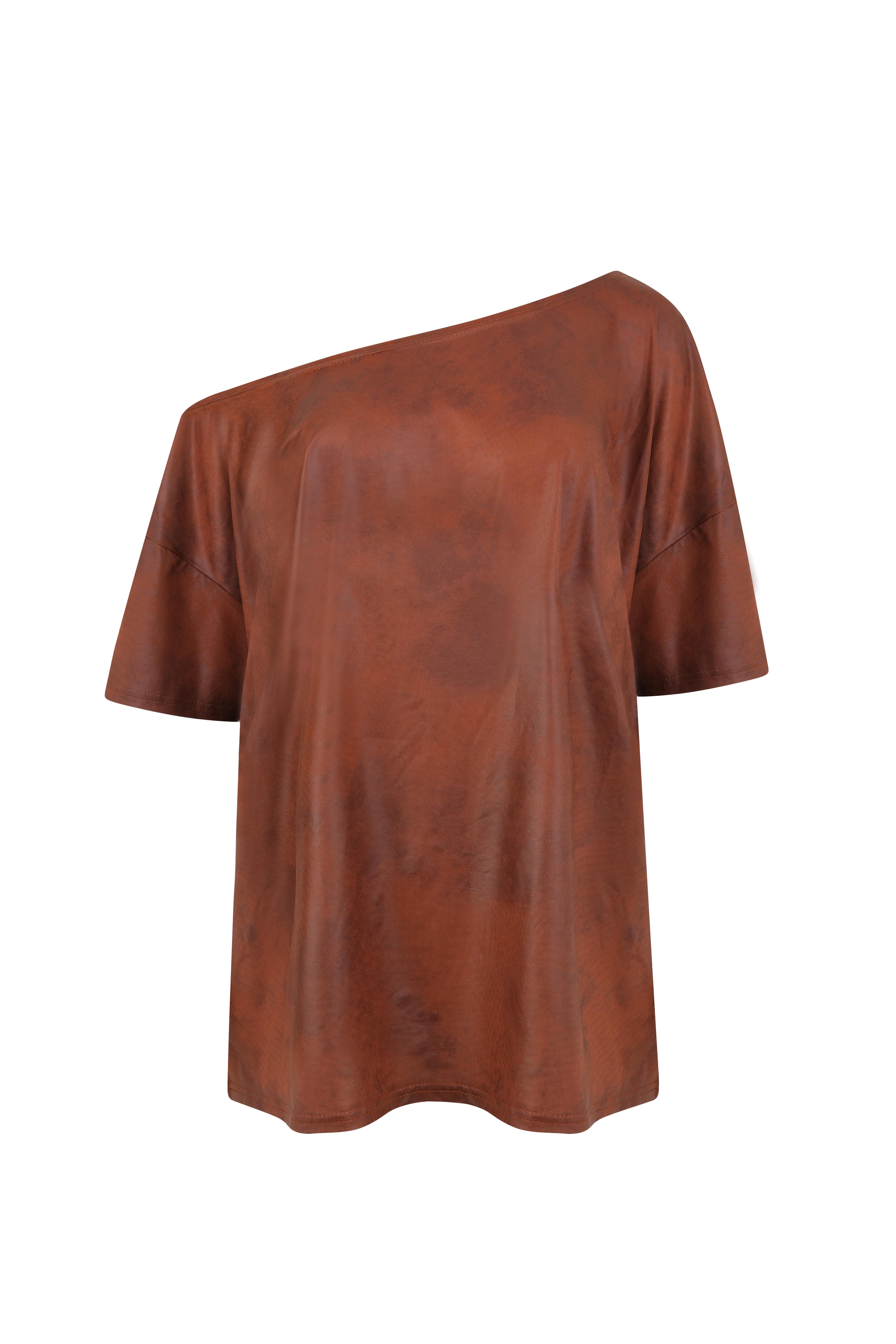 İnce Deri görünümlü kumaşı ve asimetrik omuz detayı ile modern bir görünğm sunar.