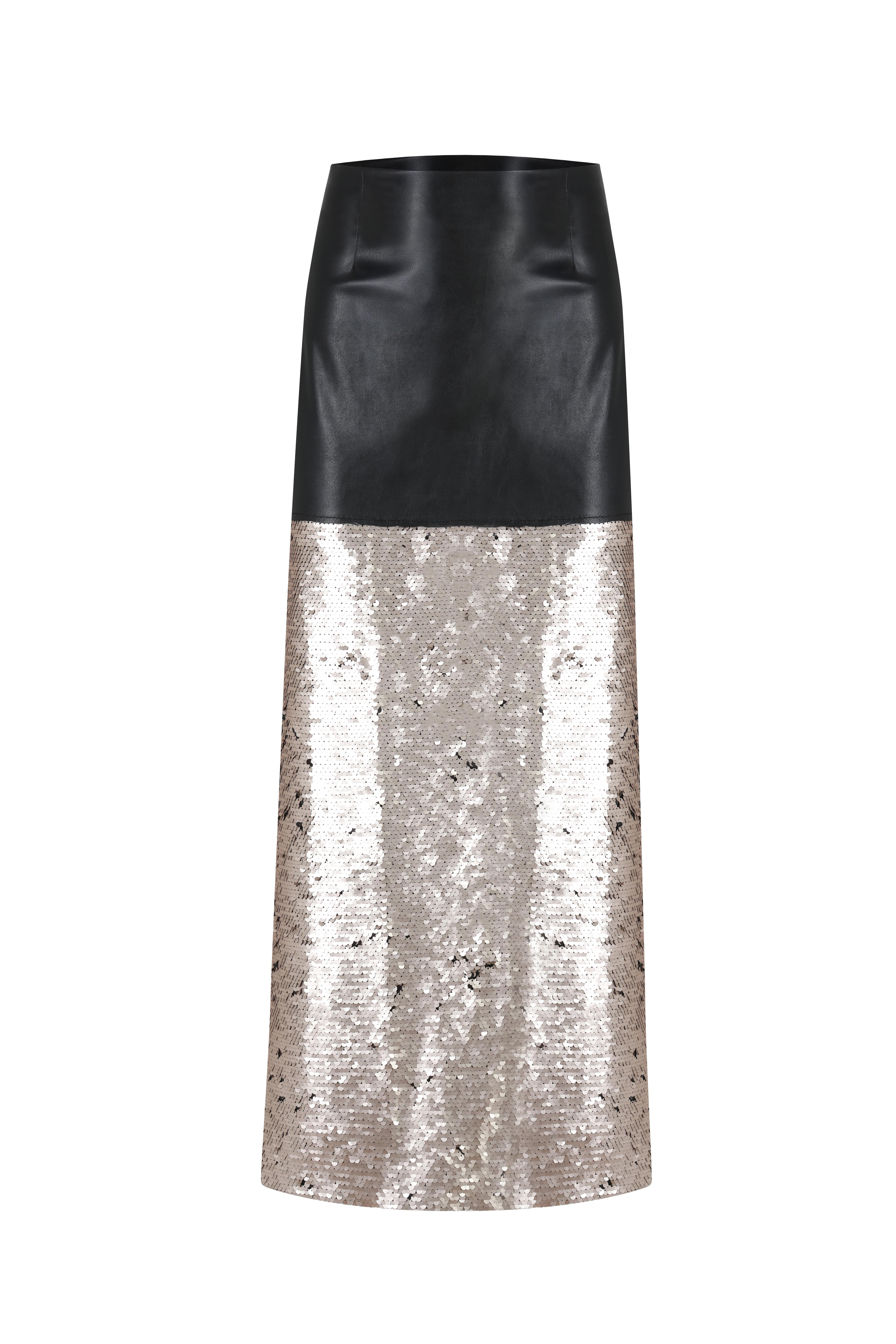 Kontrast Payet Deri Uzun Etek