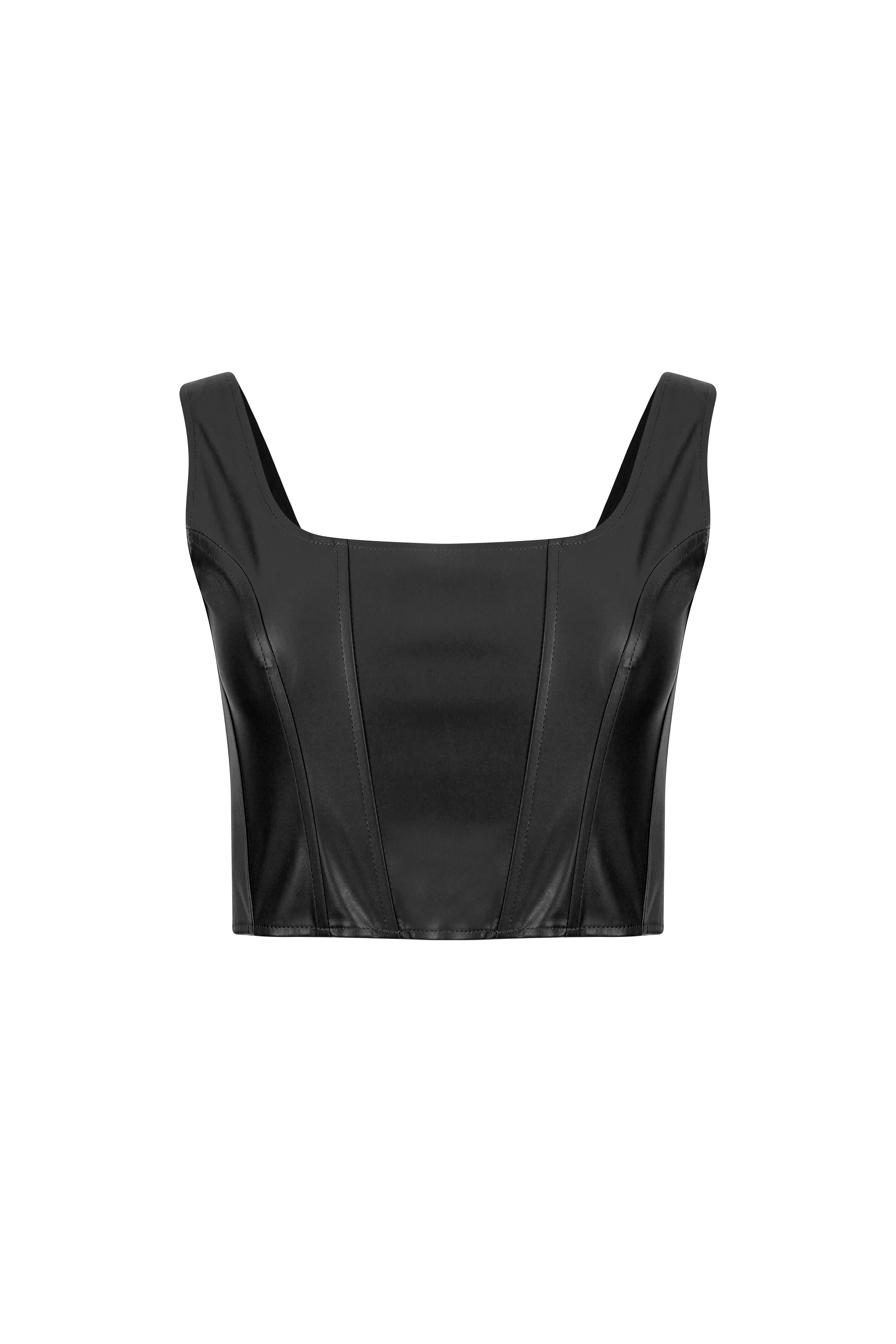 Likralı vegan deriden tasarlanan balenli bu crop top modern ve feminen bir sıluet sunar.